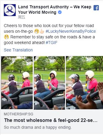 就连陆路交通管理局(LTA)也关注了此事,在Facebook页面上表扬那些时刻注意到其他公路使用者安全的公众,并且也借此机会提醒大家在公路上多注意安全。