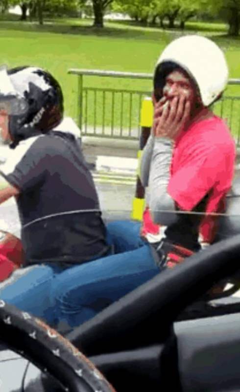 没错,就是后面这位小哥把自己的头盔戴反了!