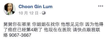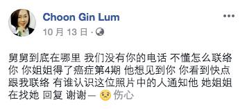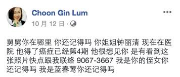 网友Choon Gin Lum在脸书上发帖,为自己患癌症末期的母亲寻找失散多年的亲人!