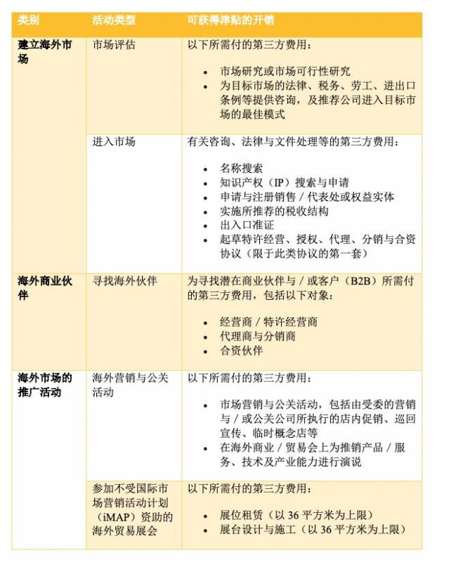 新加坡公司可以为着重于建立海外市场、寻找海外商业伙伴及在海外市场进行推广的预设活动申请财务援助。