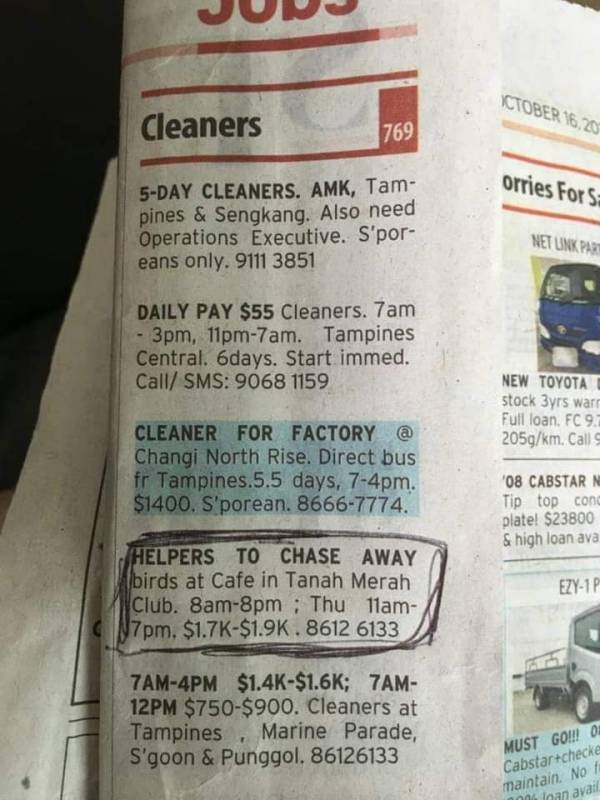 社交媒体流传一则招聘广告,一家位于“丹那美拉俱乐部”的咖啡厅聘请助手帮忙赶鸟,工作内容听起来古怪有趣,引起网民关注。帖文星期三发布后,截至星期五下午6点半已有超过2600人分享。