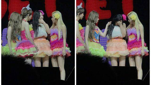 广告Red Velvet的成员突然停止表演,原本说是Joy的耳机出问题,后来Joy从后台走到台上,右手裹着绷带,哭着向现场的粉丝道歉,说她虽然很想继续表演,但是她得去医院。
