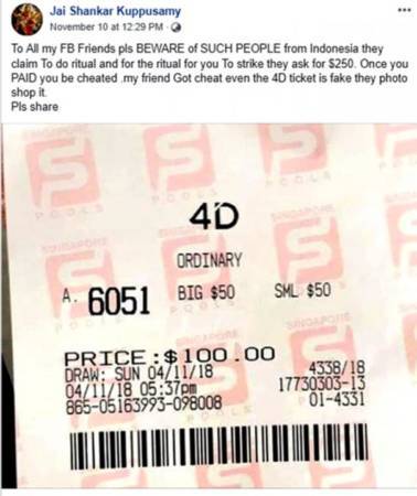 最近,有网民在面子书贴文,提醒公众警惕一个来自印尼的诈骗组织,对方声称可以做法事,帮人赢万字票。