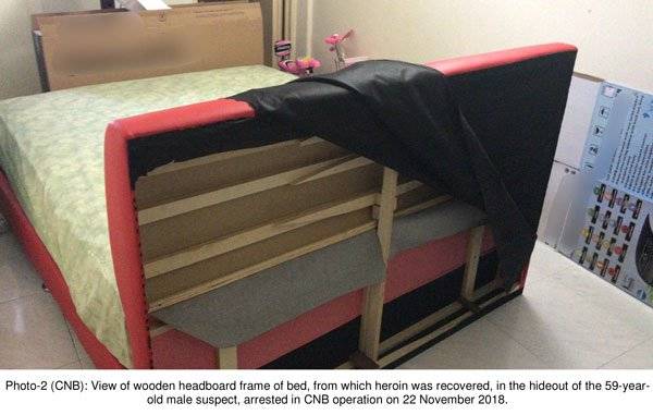 毒贩将14个藏有海洛因的包裹藏在床头板里。(肃毒局提供)