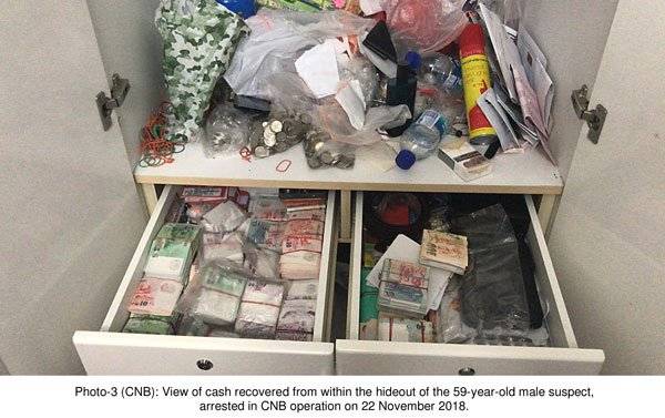 (新加坡24日讯)床头板塞白粉,衣橱装现金,就连电动踏板车也成了藏毒工具!海格路组屋单位变“海洛因专卖店”,肃毒局上门突击,起获4.26公斤、市价近30万元(90万令吉)海洛因,同时搜出满满一抽屉的现钞。
