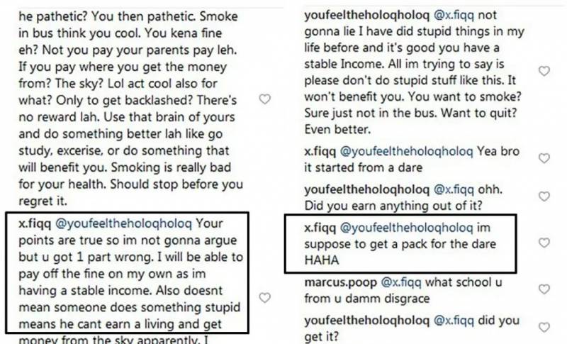 据了解,吸烟的男子随后留言反击,但目前他已经关闭了Instagram账号,留言也已不在页面上。网络媒体慈母舰(Mothership) 的截图显示,男子在关闭账号前留言回呛“我有能力缴付罚款,因为我有稳定收入。而且一个人做蠢事,不代表他不能赚钱,让钱从天而降。”