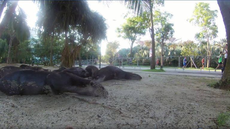 十只成年水獭和六只小水獭,星期天早上出现在滨海湾花园一带,正好是渣打银行新加坡马拉松参赛者会经过的路段,有网友昨天早上11点在Facebook上载视频,画面中可以看到水獭在沙地上翻滚,把身上湿漉漉的毛发弄干。而沙地竖起栏杆的另一边就是马拉松的赛道。