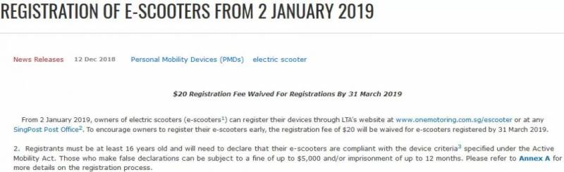 未满16岁的使用者可由父母或家人帮忙注册。车主注册时也须申报电动踏板车符合活跃通勤法令的规定,未据实申报者可被罚款最高5000元或坐牢最长12个月,或两者兼施。