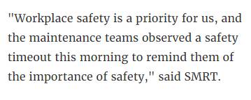 对于此次事故,SMRT表示原因还在调查中,他们会彻查,并给予伤者和家属必要的援助。同时,他们也会检讨,更重视职场安全,采取一些必要的措施防止类似事件的发生。