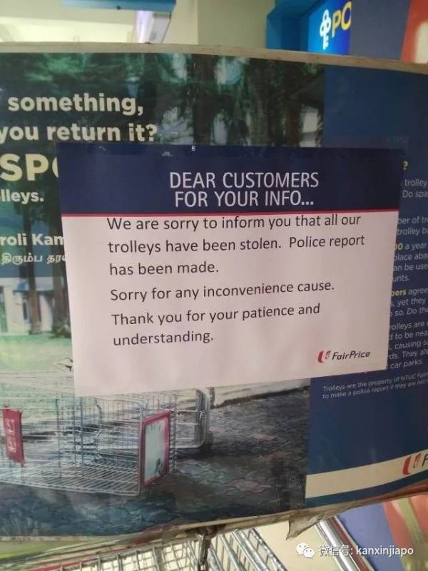 震惊之余,Fair Price只得无奈贴出告示:嘿,购物的朋友们,抱歉地通知您,我们所有的购物推车都被偷走了.......我们已经向警方报警。对于所造成的不便,我们感到抱歉。谢谢您的耐心和谅解。