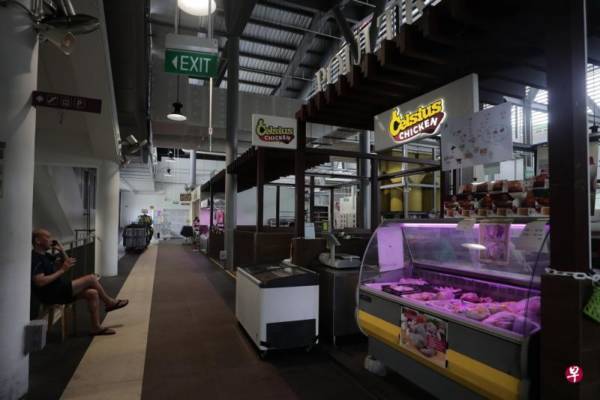 武吉班让小贩中心和湿巴刹,二楼湿巴刹的28摊生鲜摊只有21摊开业,生意淡静。(海峡时报)