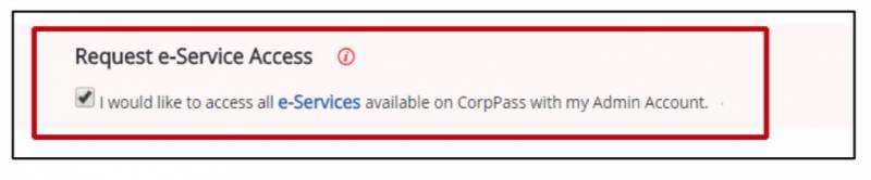 d) The option I would like to access all e-Services available on CorpPass with my Admin Account is checked by default. By selecting this option, you will be able to access all digital services currently onboard CorpPass.