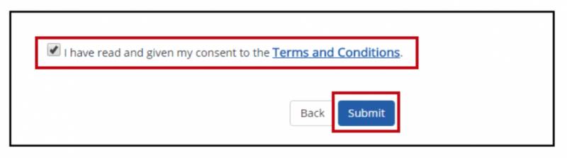 Confirm your registration details by checking the I have read and given my consent to the Terms and Conditionsbox before clicking on Submit.