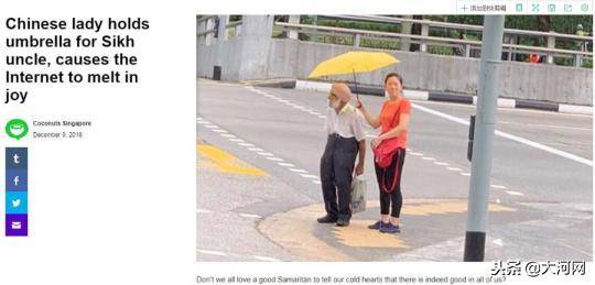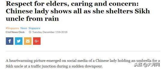 美国雅虎新闻网报道称,本月8日,在新加坡的一个交通路口处,一名中国女性和一名印度锡克教徒打扮的老者正在等红灯。彼时,天上突然下起了倾盆大雨,而这名老者并没有带伞。旁边的那名中国女性主动为老者撑起了伞,而她自己整个身子几乎都暴露在了大雨中。