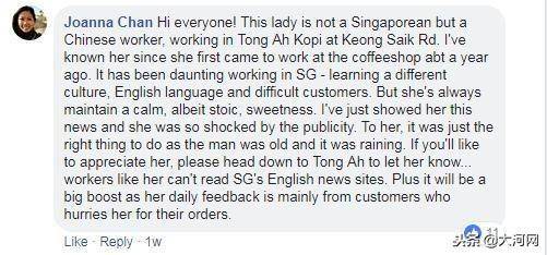 那么这名女子到底是谁呢?与她相识的网友“Joanna Chan”这样写道:“嗨,大家好!这名女士不是新加坡本地人,而是从中国来这儿工作的,她在恭锡路(Keong Saik Road )一家咖啡馆工作。大概一年前,她刚到咖啡馆工作的时候,我就认识她了。在新加坡工作真的是挑战很多,要适应一种新的文化、学习英语,有时还要应付难缠的顾客。但她总是很平静淡定隐忍,待人友善。我把这条新闻给她看了,她对大家对这件事的关注度感到很惊讶。对她来说,当看到一个老人淋著雨时,她肯定要那么做,她只是做了正确的事而已。”