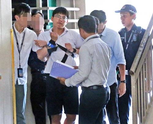 僵持了半小时后,重组了案情,被告才被押回停车场。案件将于下周三过堂。