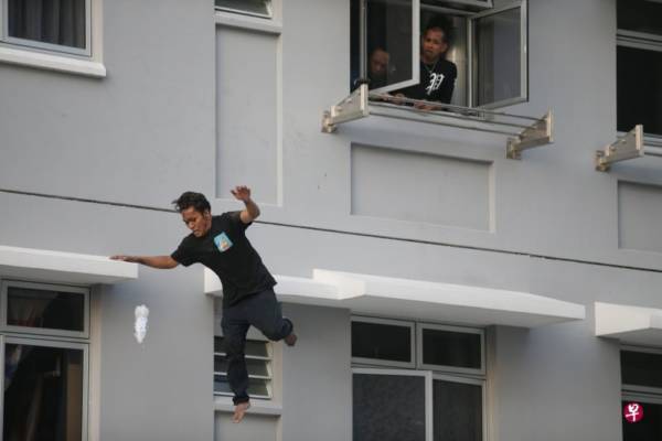 据他说,男子一手扶著窗户,然后从一个单位墙沿跳到另一个单位的墙沿,民防人员还因此移动了气垫。