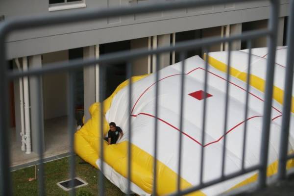 民防人员在现场铺起两个气垫, 及在楼上放置安全网。警员则在五楼的厨房,与男子交涉,设法安抚他劝他进入屋内。