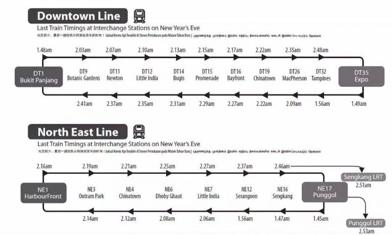 眼看着2019年就要到来了!相信很多朋友都准备去跨年了吧!那么跨年当晚的巴士和地铁服务时间表你一定不能错过啊!在看烟花倒数的同时,怎么回家也是个问题啊!新捷运26日表示,旗下的地铁东北线(NEL)和滨海市区线(DTL)的服务时间将延长至少两小时。
