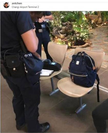 陈哲艺昨天在个人IG放上一张有机场警员看守一个黑色背包的照片,文中写到放婴儿用品的包包留在樟宜机场抵境厅,惊动警察,感觉像是营造了一场疑有爆炸物的虚惊。