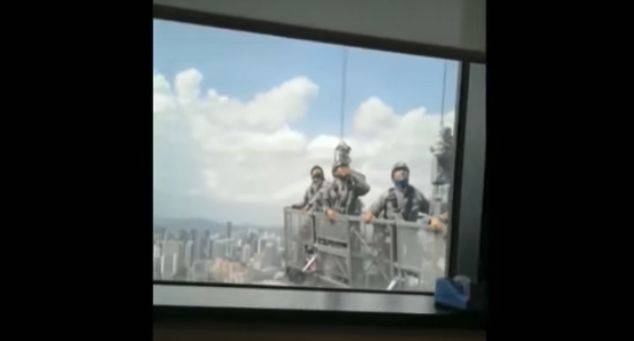 视频是从大楼内部向外拍摄,可以看到,4名工人站在升降吊篮里,越来越靠近大楼的玻璃,其中一名工人还伸出手,似乎是要阻挡撞上玻璃墙。