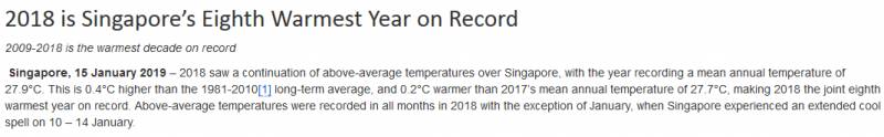 总体而言,新加坡10大最热年份都发生在过去25年,其中八年更是发生在本世纪。2009年至2018年的年平均温度为27.89摄氏度,高于上一次记录(1997年至2006年)0.02摄氏度,显示新加坡不断升温的长期趋势。本地历来最热年份是2016年,年度平均气温达28.4摄氏度。