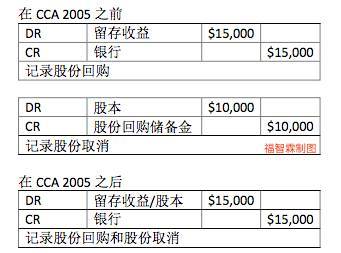 在 CCA 2005 之前,公司可以自由回购其股票,回购资金可以来自留存收益(或可分配 利润)。股份一旦被回购,则立即被视为取消。 取消后,回购股份的总面值必须从股 本中转移去资本赎回储备金,这整个程序通常被称为 “股票回购 (Share buyback)”。