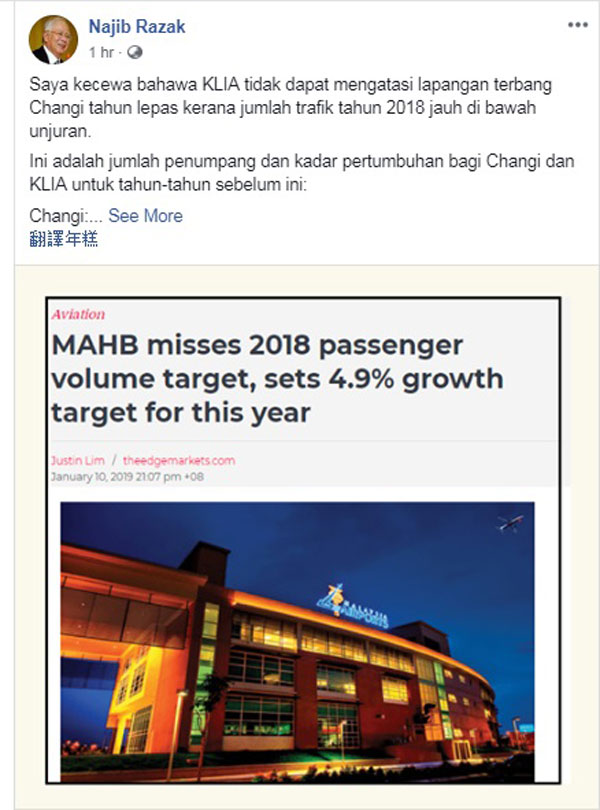 纳吉在面子书撰文,表达对吉隆坡国际机场于2018年客流量,无法击败新加坡樟宜机场感到失望。