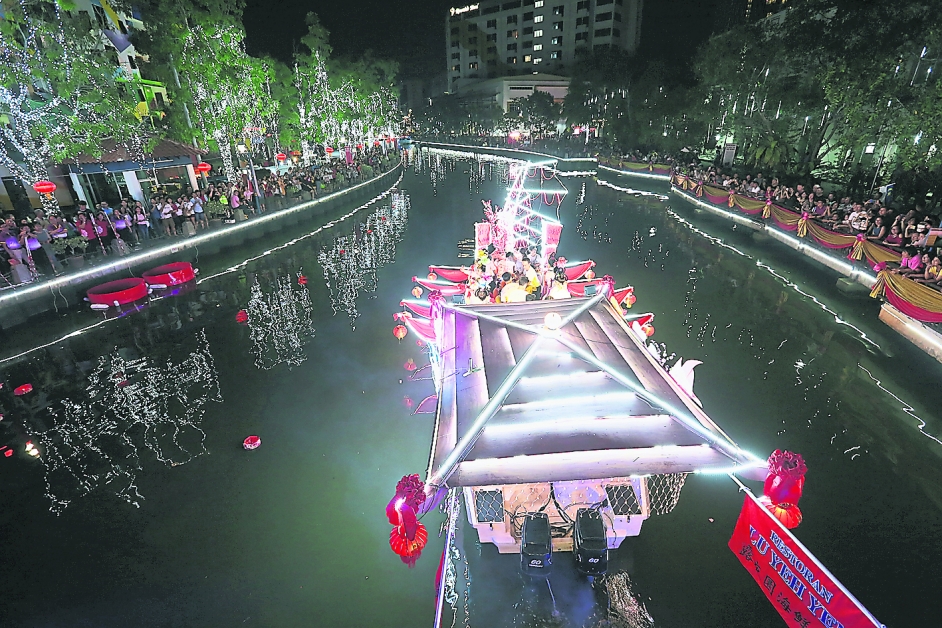 由马六甲鸡场街宗乡团联谊工委会、甲市区国会社区中心及哥打拉沙马那发展与协调委员会联合主办的“春到河畔庆元宵”,昨晚在甘榜于汝906河畔酒店后方的河畔两岸盛大举行。