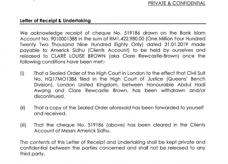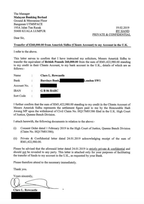克莱尔也展示了多份证据的图片,包括一张伊斯兰银行的支票、保密协议、英国高庭庭令、及一封要求马来亚银行转账的信函;克莱尔也证实有关信函正是人民公正党主席拿督斯里安华,日前声称掌握哈迪阿旺支付140万令吉给她的证据。