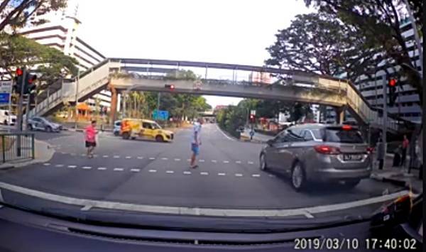 (新加坡12日讯)吓坏阿公了!轿车冲太快,驶至行人道时疑来不及停车,险些撞上越过道路的阿公,之后司机尴尬地退车让行人走,但依旧遭网民斥责:“迟多一秒,可是要了阿公的命啊!”
