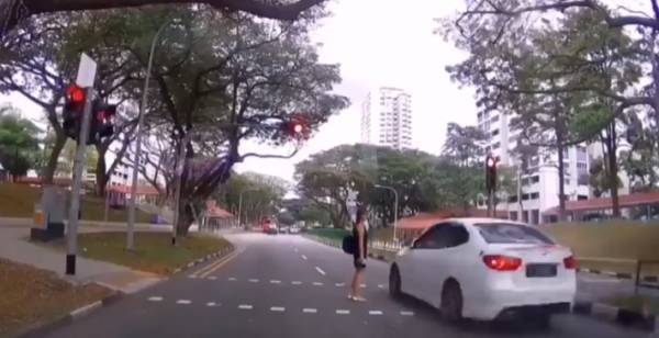 Facebook社群网页SG Road Vigilante前天和昨天(11日)发布2段行车记录器示频,皆是行人道轿车指示灯已转红,但轿车司机未依据红灯停下,险些撞上越过道路的行人!