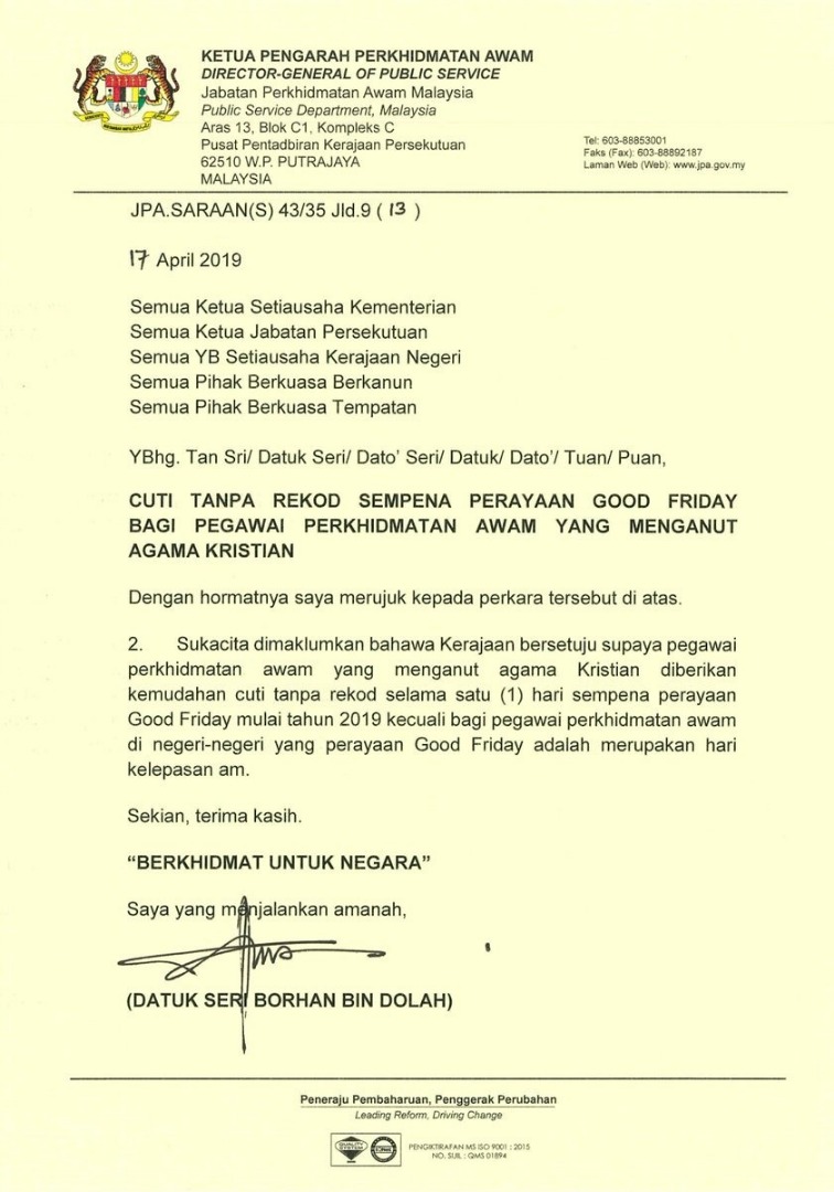 (吉隆坡18日讯)政府在耶稣受难日(Good Friday)前夕,为基督教公务员捎来好消息!