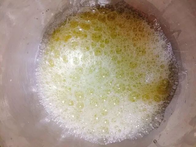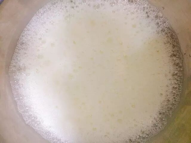 04蛋白加入干净无水的盆中,盐和柠檬汁加入蛋白,用电动打蛋器高速开始打发,打到蛋白呈现大鱼眼泡的状态,加入1/3的糖