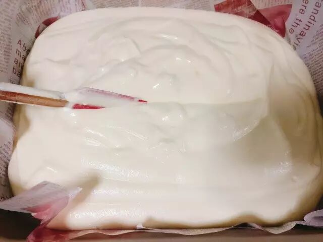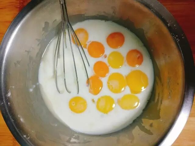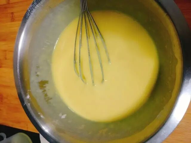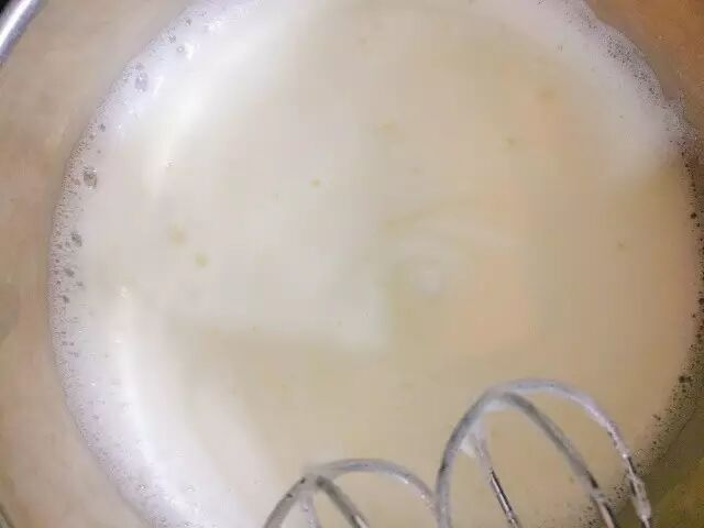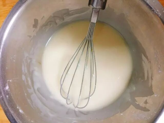 03倒入牛奶和蛋黄,用蛋抽搅拌成光滑的蛋糊即可