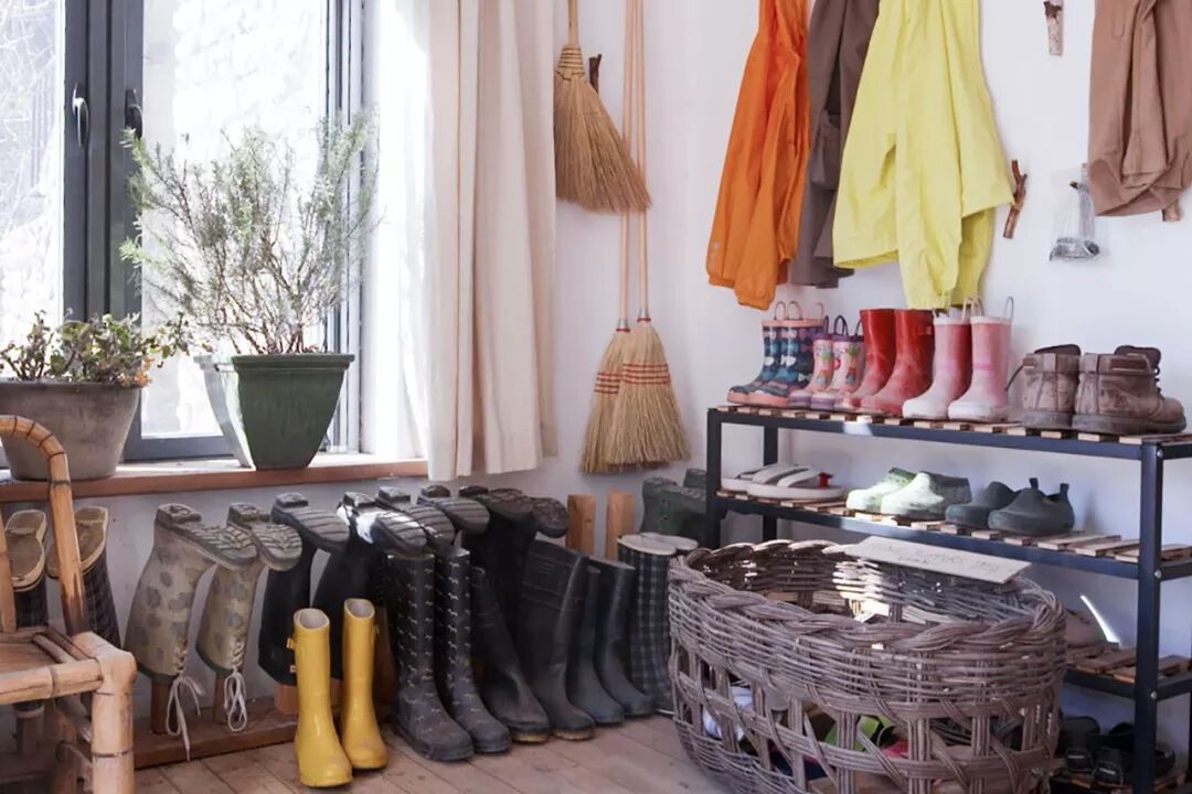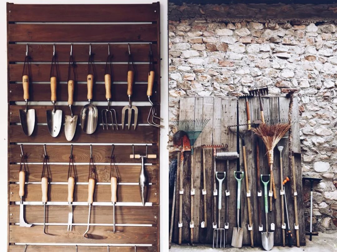 我还是一个园艺控、收纳控。农作工具、篮子、鞋子,都有各自摆放的位置。因为地方大,很容易遗失一些大的工具,我们就用旧床板做了工具墙。