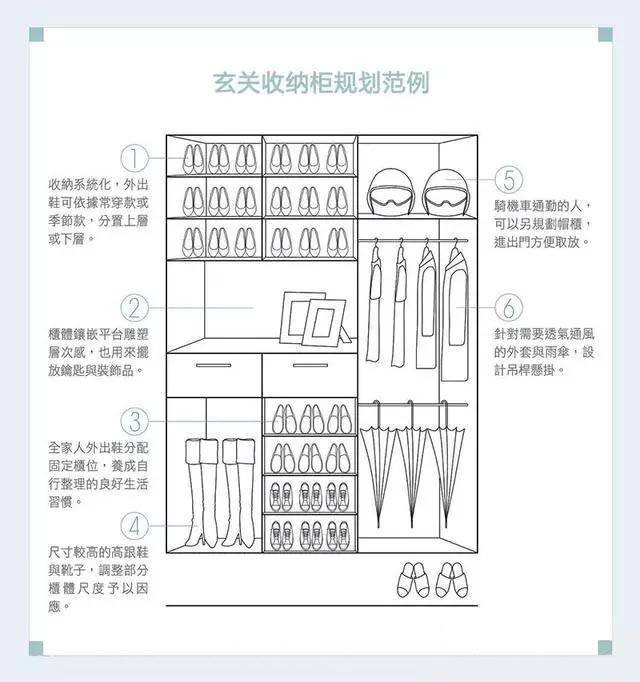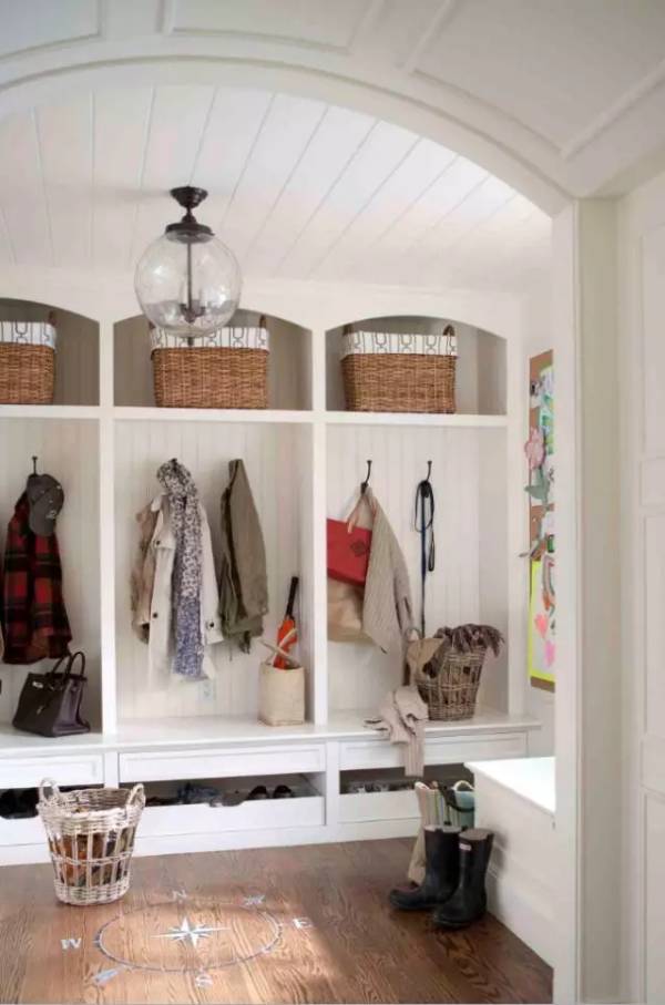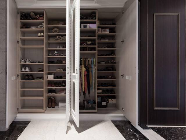 还有最好设置“常鞋位”,就是指鞋柜下部的空间,方便摆放家居拖鞋等,或者也可以把刚换下来的鞋放一会,透透气,再放到鞋柜里。这种悬空高度一般为25㎝。