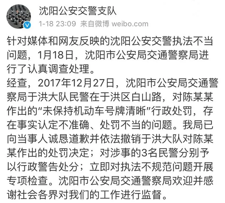 据@沈阳公安交警支队18日晚最新消息:针对媒体和网友反映的沈阳公安交警执法不当问题,1月18日,沈阳市公安局交通警察局进行了认真调查处理。