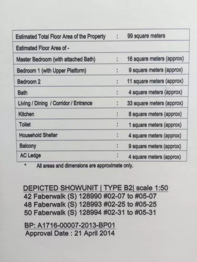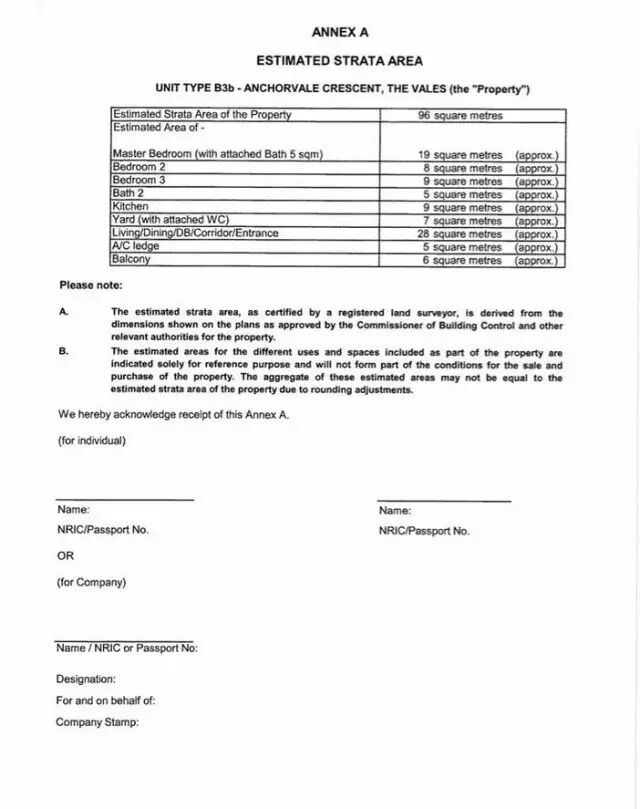 记住哦,在你准备给5%定金支票的时候,发展商会给解释一份PDI(Particular, Documents, Information)。里面一定会有一份文件叫做Estimated Strata Area,会详细描述房子每个部分的面积。PDI整套会很厚,千万不要草草签字了事。如果你发现房间面积很小,不接受。你是可以收回你的5%的支票哦。给大家看看这个文件的范本(这个户型阳台不坑爹,大小刚刚好):