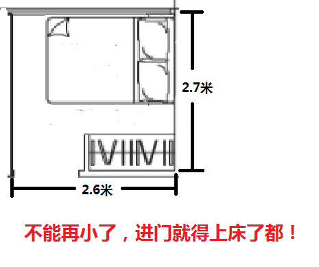 可以再小一点吗?那就床靠窗户吧,记住留个10公分的间隙给窗帘(汗)。2.6x2.7 = 7平米。要知道新加坡算面积要考虑墙的哈,如果你看到发展商告诉你一个房间的面积低于7平米,还可以放双人床,你一定要让他给你画出来,怎么放的床。就像小编这样,图糙理不糙。