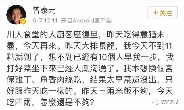 而且不仅仅是学生,老师也被大厨的锅铲征服,微博认证为“东吴大学副教授”的曾泰元,连续两天去川大窗口蹲点……